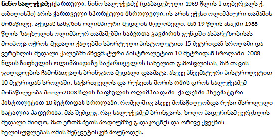 Nino Salukvadze (Georgian) (born February 1, 1969 in Tbilisi) is a female Georgian sports shooter. She is a six-time Olympian and has won medals on three occasions. At age 19 and competing for the Soviet Union at the 1988 Summer Olympics, she won a gold medal in the women's 25-metre sporting pistol competition and silver in the women's 10-metre air pistol competition. At the 2008 Summer Olympics, competing for Georgia, she added to her tally with a bronze medal, also in the 10-metre air pistol event.Georgia and Russia were at war when Salukvadze competed in the women's 10-metre air pistol competition of the 2008 Summer Olympics with Russian shooter Natalia Paderina. After Salukvadze won the bronze and Paderina the silver, they shared a kiss on the podium and called on the two governments to end the war.