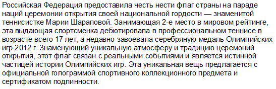 The Russian Federation bestowed the honour of bearing the county's standard in the Opening Ceremony's Parade of Nations upon their nation's pride: Tennis superstar Maria Sharapova. Ranked #2 in the world, the sporting prodigy made her professional tennis debut when she was only 17, and recently took home the 2012 Olympic silver medal. Capturing the unique atmosphere and tradition of the Opening Ceremony, this flag carries a true story, and is a distilled piece of history from the Olympic Games. The unique asset will come with an Official Sporting Memorabilia hologram and Certificate of Authenticity.