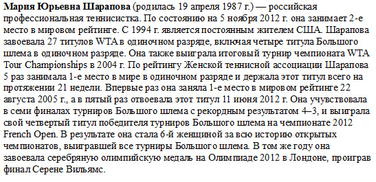 Maria Yuryevna Sharapova (Russian: born April 19, 1987) is a Russian professional tennis player. As of November 5, 2012 she is ranked World No. 2. A United States resident since 1994, Sharapova has won 27 WTA singles titles, including four Grand Slam singles titles. She has also won the year-end WTA Tour Championships in 2004. The Women's Tennis Association has ranked Sharapova World No.1 in singles on five separate occasions, for a total of 21 weeks. She became the World No.1 for the first time on August 22, 2005, and regained the ranking for the fifth time on June 11, 2012. She has been in seven Grand Slam finals with a record of 4-3 and capturing her fourth grand slam title at the 2012 French Open. By doing so, it made her the 6th woman in the Open Era to complete the career Grand Slam. In the same year, she won an Olympic silver medal in the London 2012 Olympics, losing the final to Serena Williams.
